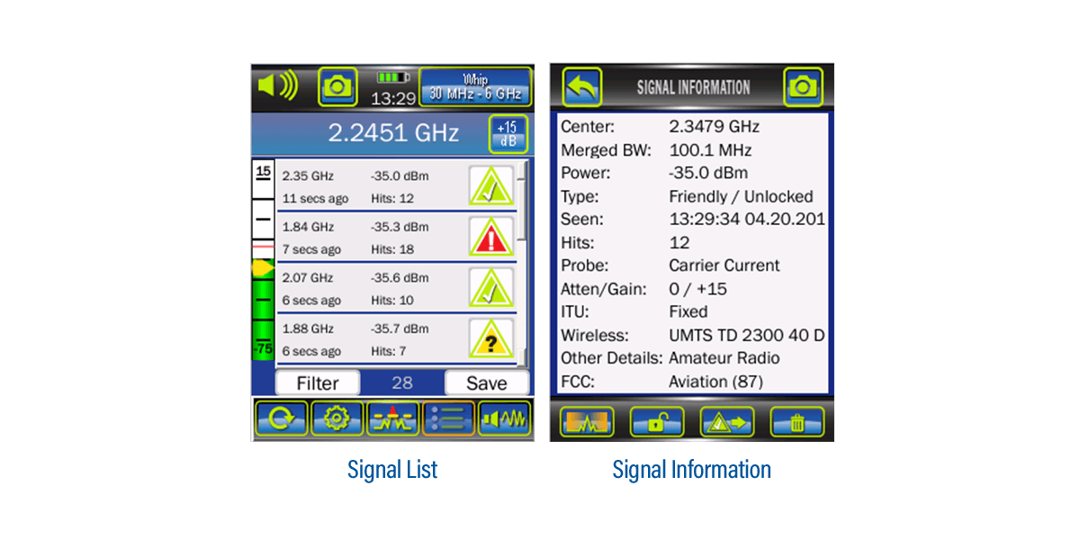 Визначення належності виявлених сигналів до дозволених діапазонів згідно з МСЕ (ITU). Автоматичне створення списку сигналів щодо перевищення порогу. Створення списків “дружніх” сигналів, за датою/часом, тощо. Індикація рівня сигналу, виведення потужних сигналів на початок списку. Детальна інформація про сигнал: частота, рівень потужності, діапазон, дата/час, кількість виявлень, тип сигналу.
