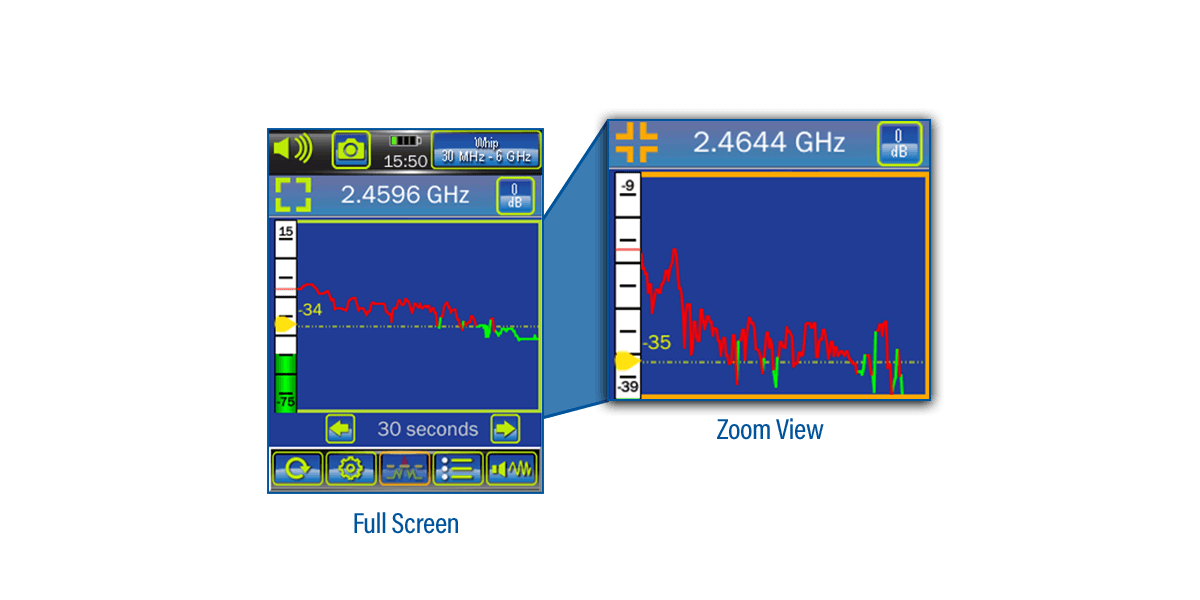 Функція масштабування дозволяє користувачам зосередитися на певному сегменті 30 дБ, що дозволяє виявляти навіть найменші зміни в радіочастотному середовищі. Ця функція особливо корисна для детального дослідження та розуміння зібраних даних, дозволяючи користувачам виявляти незначні коливання сигналу та підвищувати точність їх аналізу.