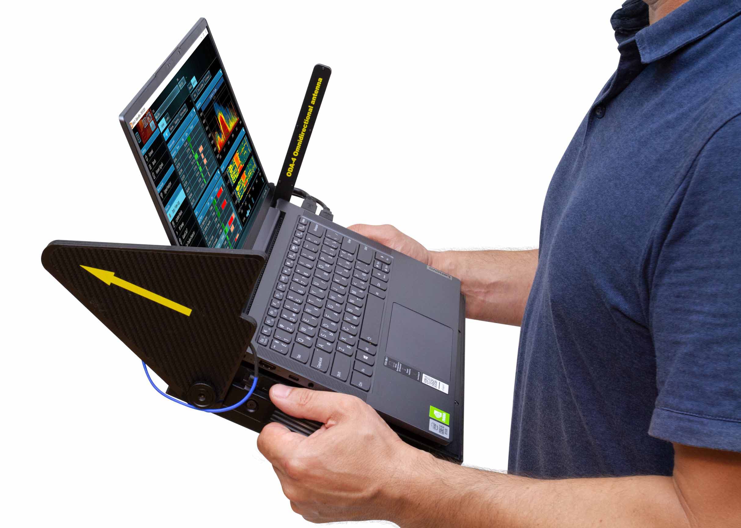 - Система працює з ноутбуком або планшетом та живиться від нього. Надійно з’єднується з ноутбуком або планшетом щоб переміщуватись під час пошуку та локалізації. Має зручну магнітну система кріплення ноутбука / планшета до головного блоку.
