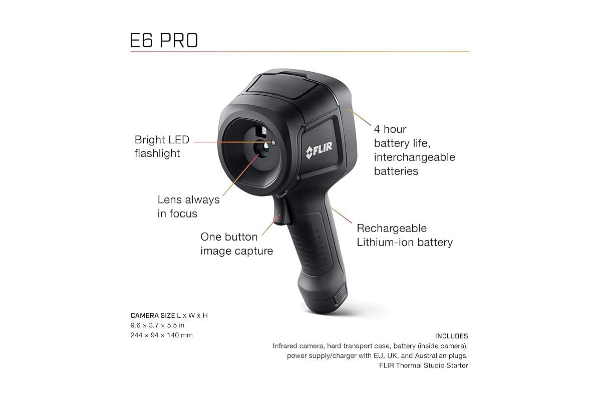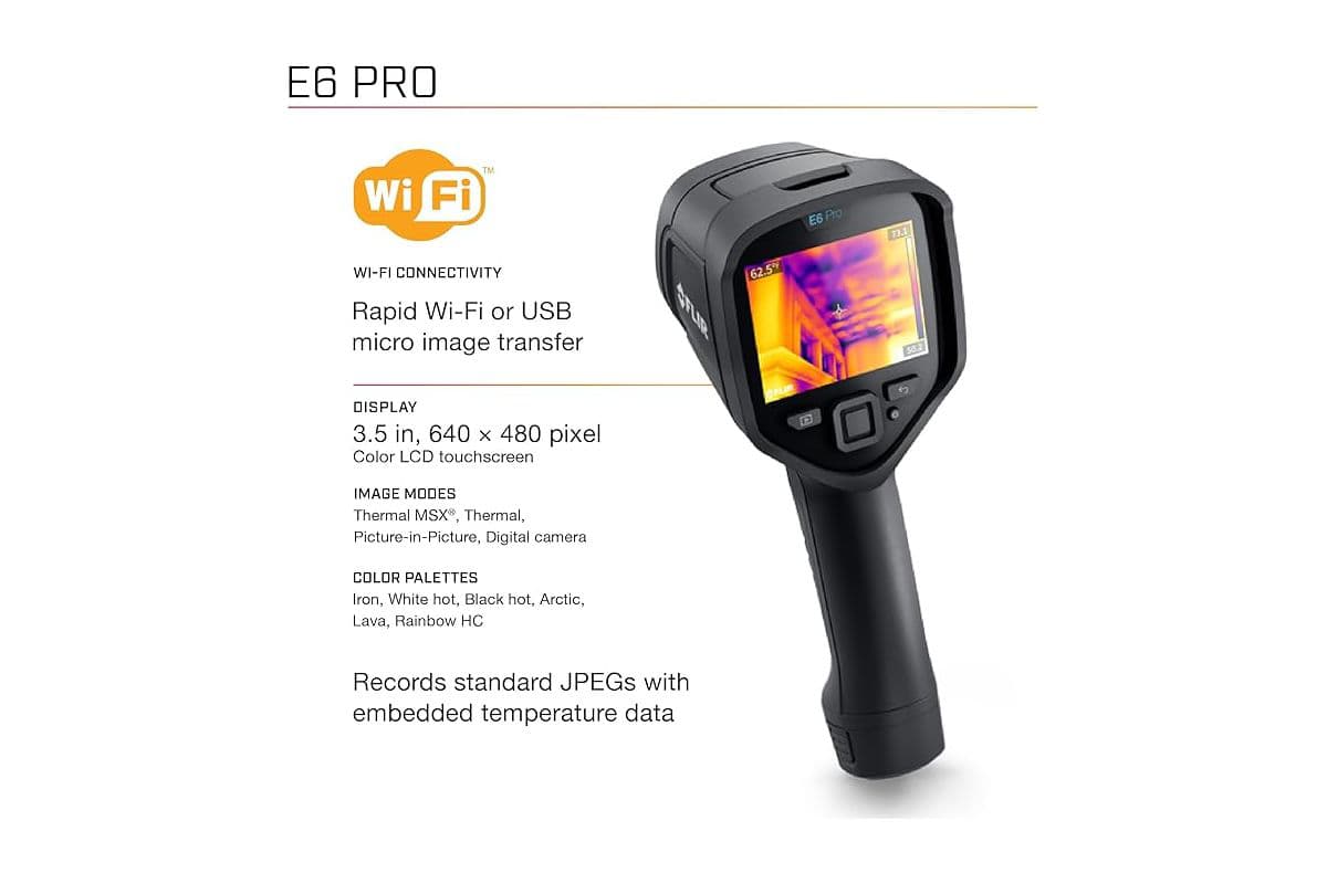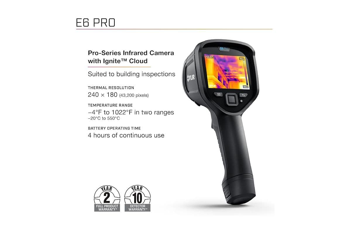 FLIR E6 Pro – це потужна тепловізійна камера типу “наведи і знімай”, яка допоможе вам проводити перевірки більш ефективно, ніж будь-коли раніше. Локалізуйте та діагностуйте проблеми швидко завдяки тепловій роздільній здатності 240 × 180 (43 200 пікселів) та яскравим тепловим зображенням, покращеним за допомогою запатентованої технології FLIR MSX® (Multi-Spectral Dynamic Imaging). Завдяки 3,5-дюймовому сенсорному екрану з роздільною здатністю 640 × 480, E6 Pro спрощує ваш робочий процес. Ви можете редагувати та організовувати фотографії, додавати детальні примітки та завантажувати файли безпосередньо з камери у хмарний сервіс FLIR Ignite для зручного доступу з будь-якого пристрою. Діліться зображеннями з клієнтами та створюйте швидкі звіти безпосередньо у FLIR Ignite або створюйте розширені звіти у FLIR Thermal Studio.