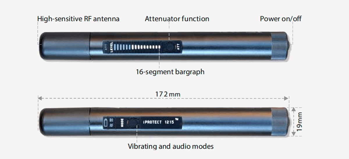 iProtect 1215 має діапазон частот від 4 до 13 ГГц – для порівняння, типові радіочастотні детектори здатні виявляти сигнали до 4-6 ГГц, зазвичай залишаючи вищі частоти непоміченими під час процедур сканування. 16-сегментний гістограмний індикатор, який дозволяє користувачеві знаходити ділянку з найсильнішим сигналом для визначення місцезнаходження. За потреби зменшення чутливості під час процесу визначення місцезнаходження можна скористатися функцією атенюатора ATT. Пристрій має фізичний рівень атенюатора радіочастотних хвиль до -20 дБ (професійний зв’язок). Три режими роботи: вібрація, звук і звичайний, які можна вибрати кнопкою MODE. Режим вібрації дуже корисний у ситуаціях, коли ви не бачите світлодіодних індикаторів, наприклад, під меблями, у важкодоступних місцях.