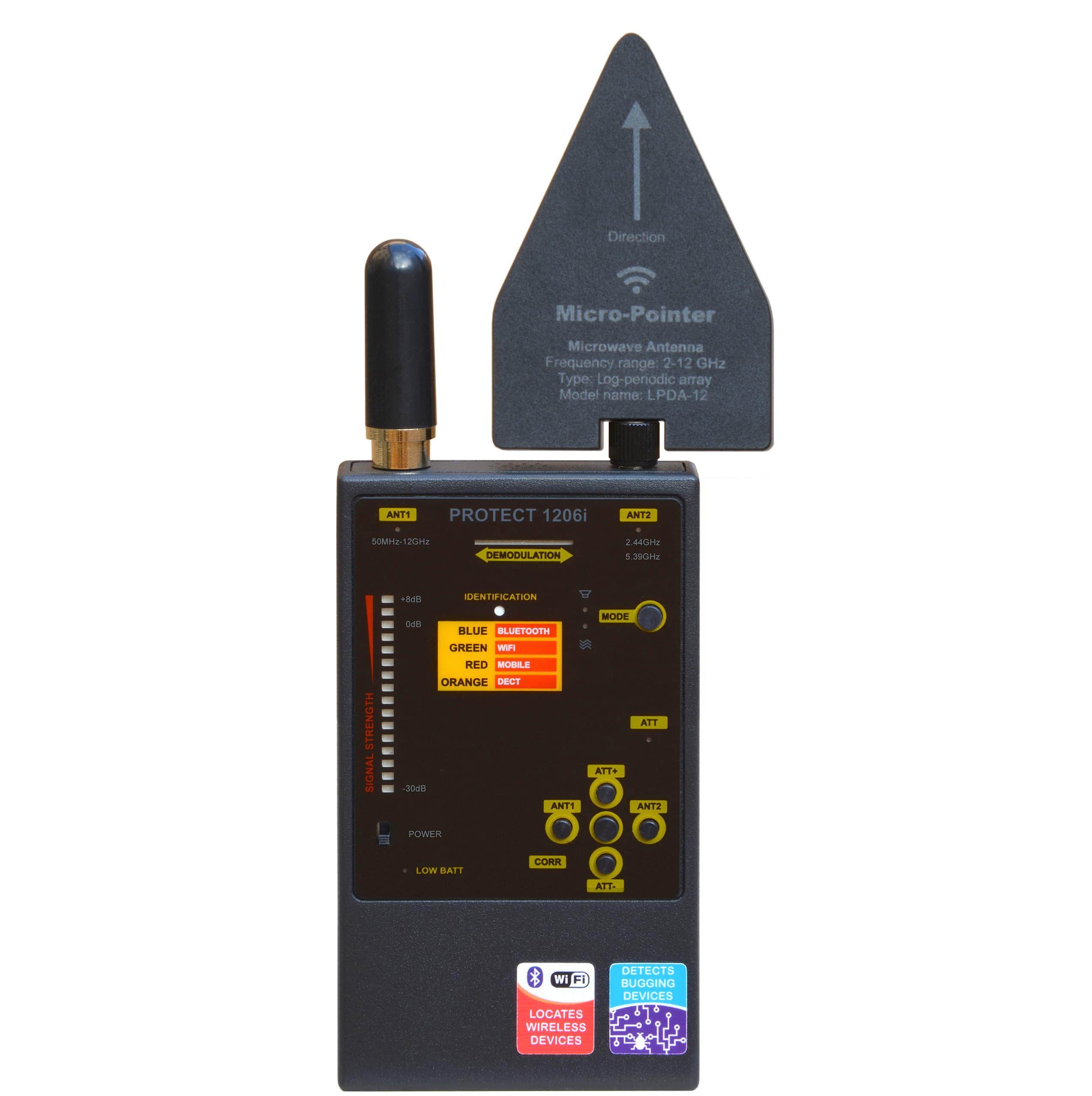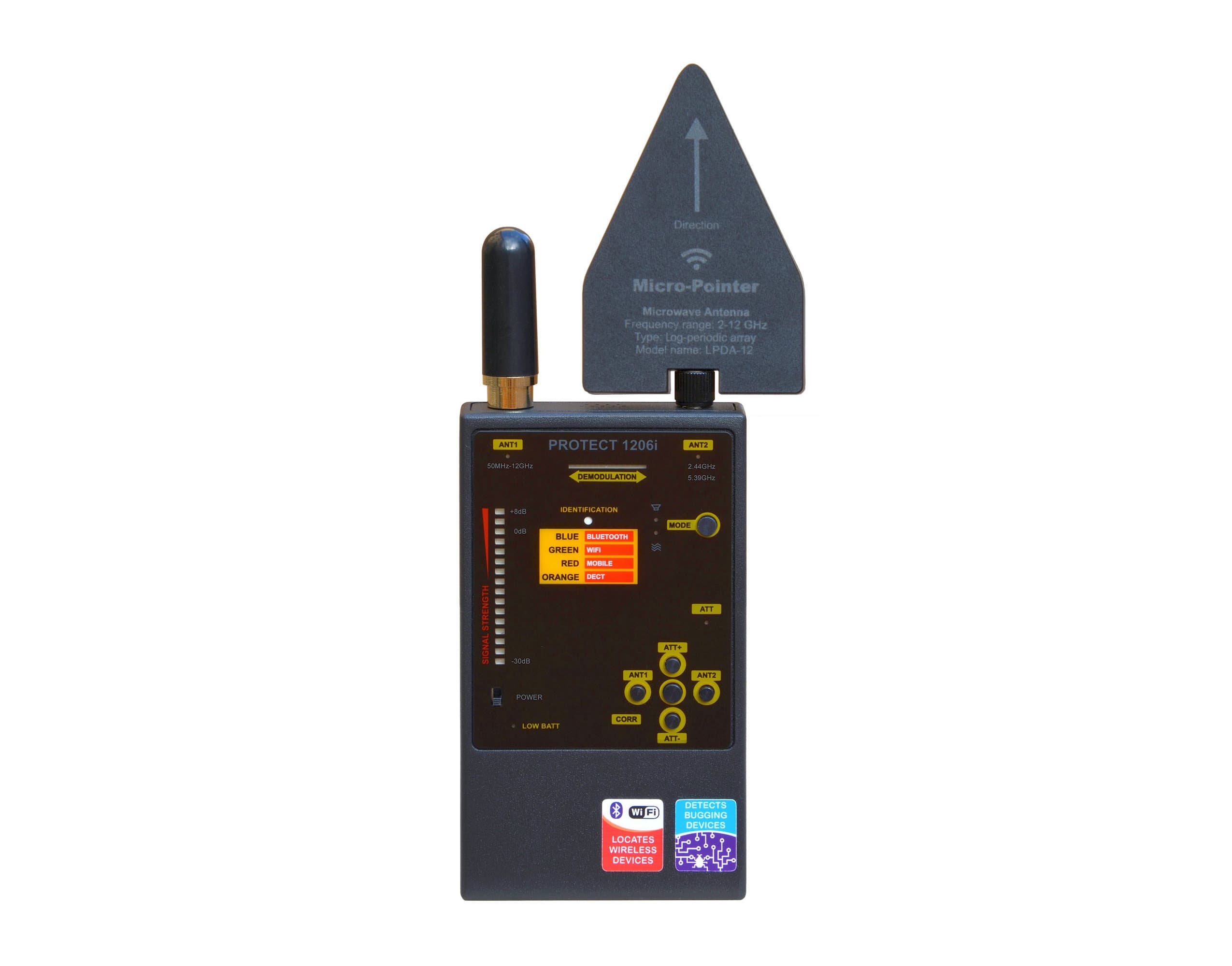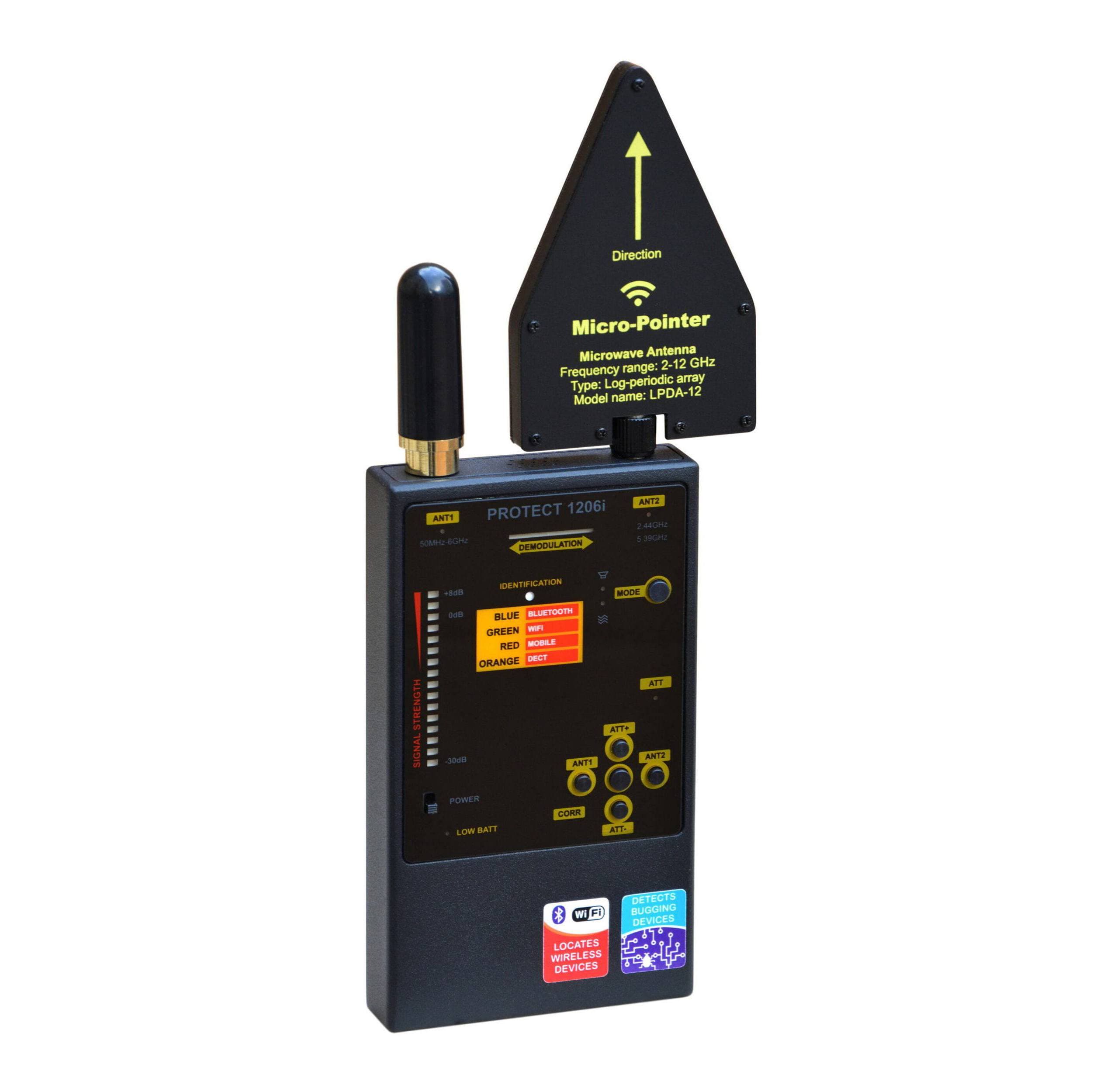 Protect 1206i - це радіочастотний детектор, розроблений Digiscan Labs для виявлення жучків та цифрових передач. Він має покращену продуктивність та прості можливості виявлення, включаючи ширше покриття при виявленні нижчих частот та точному визначенні сигналів Wi-Fi. Пристрій оснащений антенами нової конструкції для покращеної продуктивності та сумісний з додатковими антенами для розширених можливостей виявлення.
