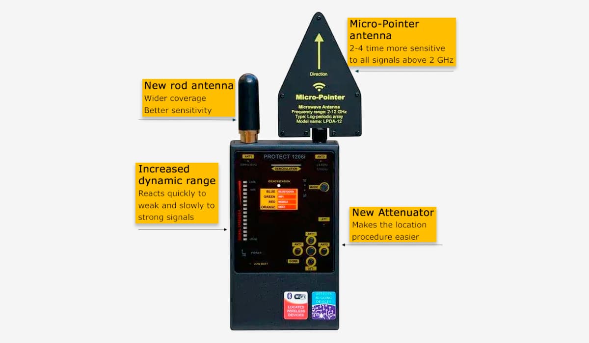 Protect 1206i пропонує нові функції, такі як ширше покриття на нижчих частотах, нова мікрохвильова антена Micro-Pointer для покращеного виявлення, розширений динамічний діапазон та новий атенюатор. Ці функції сприяють покращенню продуктивності пристрою у виявленні та локалізації жучків та цифрових передач. Новий атенюатор та динамічний діапазон полегшують визначення джерела сигналів.