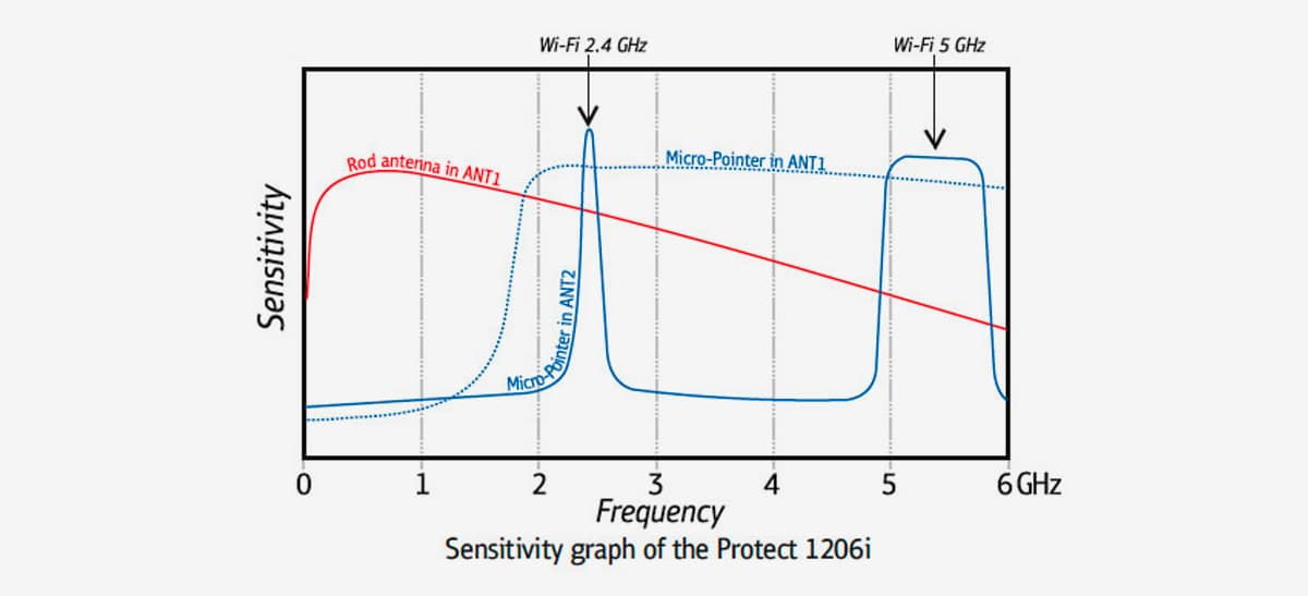 Діапазон частот для основної антени (ANT1) Protect 1206i становить 50-12000 МГц, а для допоміжної антени (ANT2) - 2,4-2,48 ГГц та 4,9-5,875 ГГц. Цей широкий діапазон частот дозволяє пристрою виявляти широкий спектр сигналів, від нижчих частот до високих ГГц-діапазонів. Наявність двох антен підвищує його універсальність у виявленні як аналогових, так і цифрових передач.