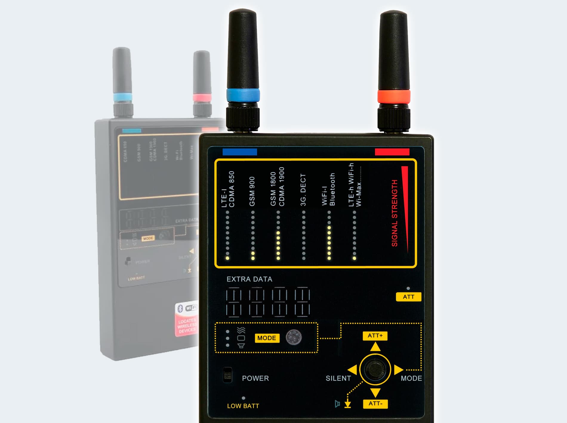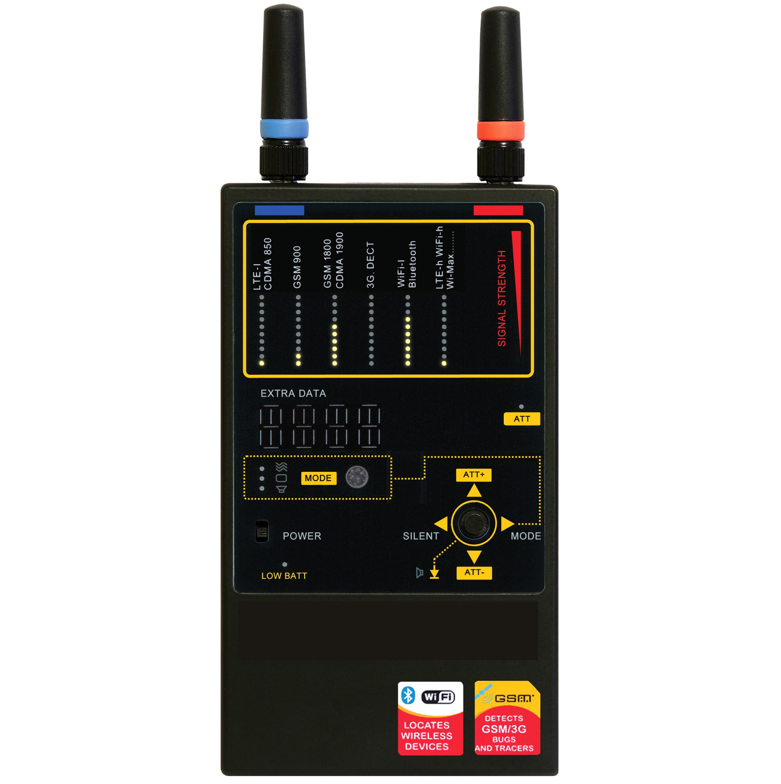 - Також охоплює 1 широкосмуговий мікрохвильовий діапазон 3000 – 7000 МГц для виявлення Wi-Fi 5.8 ГГц, WiMax та 4G/LTE.