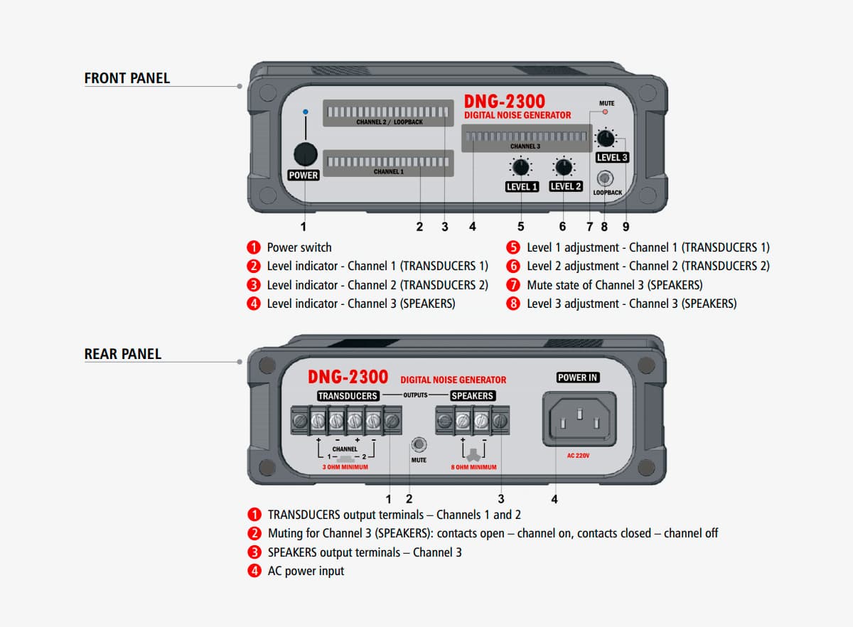 DNG 2300 — це трьохканальний генератор нефільтрованого білого шуму, призначений для захисту від акустичного та вібраційного прослуховування. Пристрій ефективний проти високочутливих мікрофонів, лазерних систем знімання звуку та інших засобів негласного перехоплення.