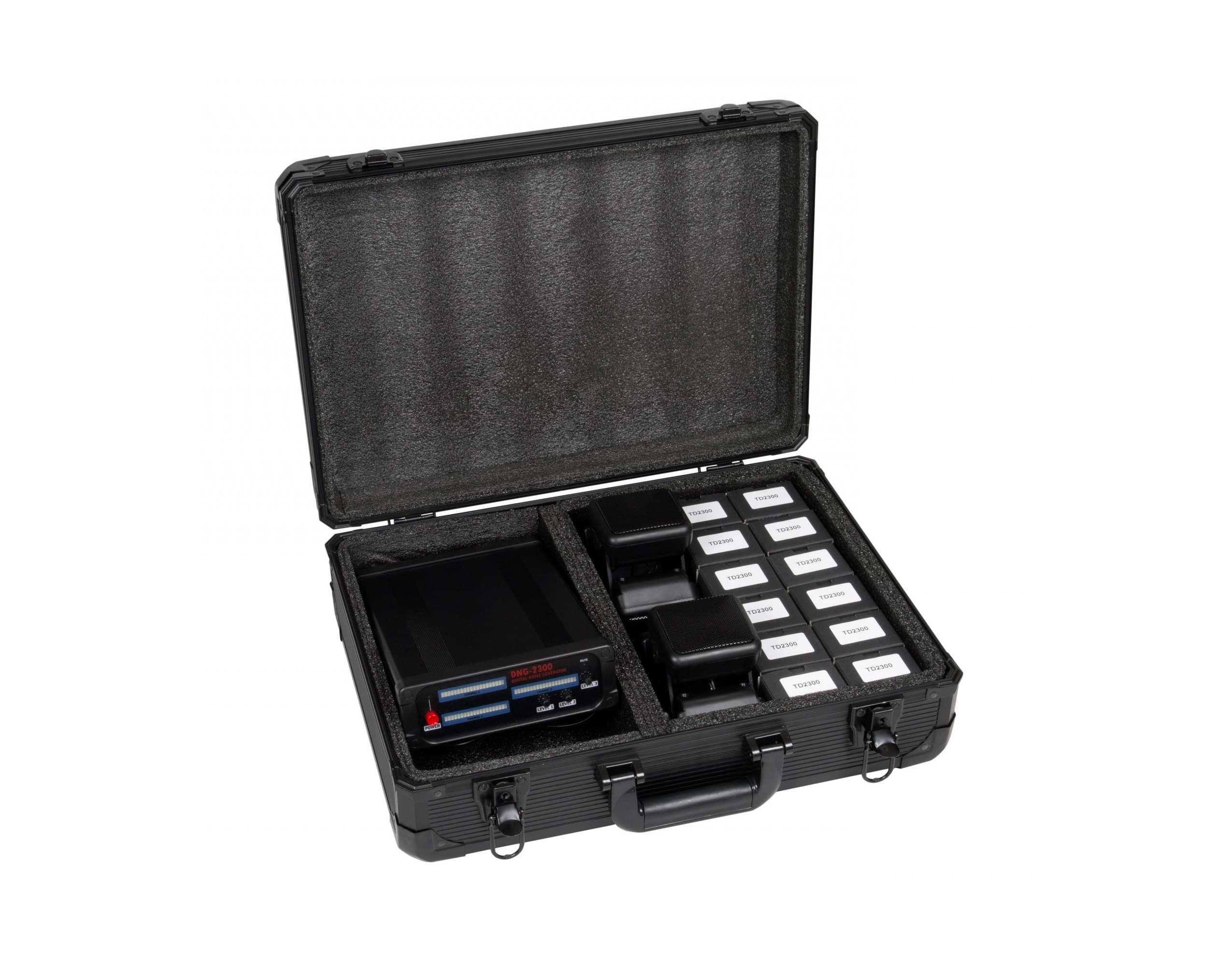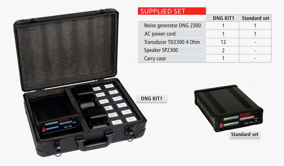 Комплект містить 1 пристрій DNG 2300, 1 кабель живлення змінного струму, 12 перетворювачів, 2 всеспрямовані динаміки та футляр для перенесення. Цей комплексний набір містить усе необхідне для налаштування системи білого шуму для контрспостереження. Наявність кількох перетворювачів та всеспрямованих динаміків забезпечує універсальні варіанти розгортання для різних середовищ.